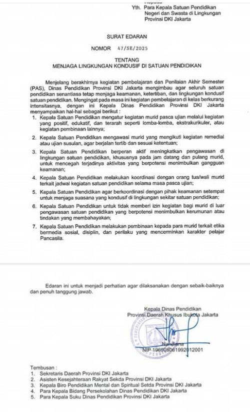 Pengarahan ini merupakan tindak lanjut dari Surat Edaran (SE) Nomor 47 Tahun 2025 yang diterbitkan Dinas Pendidikan Provinsi DKI Jakarta. SE tersebut menegaskan pentingnya menjaga suasana kondusif di satuan pendidikan selama masa pasca ujian serta mengatur berbagai langkah pengawasan untuk mencegah aktivitas yang berpotensi mengganggu keamanan dan ketertiban lingkungan sekolah.