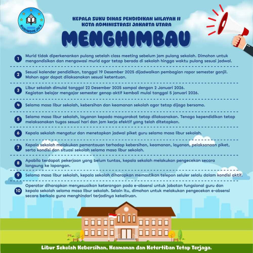 Jakarta Utara – Menjelang berakhirnya semester ganjil Tahun Pelajaran 2025/2026 serta memasuki masa libur sekolah akhir tahun, Kepala Suku Dinas Pendidikan Jakarta Utara Wilayah II menyampaikan sepuluh himbauan penting kepada seluruh satuan pendidikan di wilayah Jakarta Utara Wilayah II. Himbauan ini ditujukan kepada para kepala sekolah, guru, tenaga kependidikan, serta operator sekolah agar pelaksanaan kegiatan akademik, layanan pendidikan, dan pengelolaan sekolah tetap berjalan tertib, aman, dan sesuai dengan ketentuan yang berlaku.